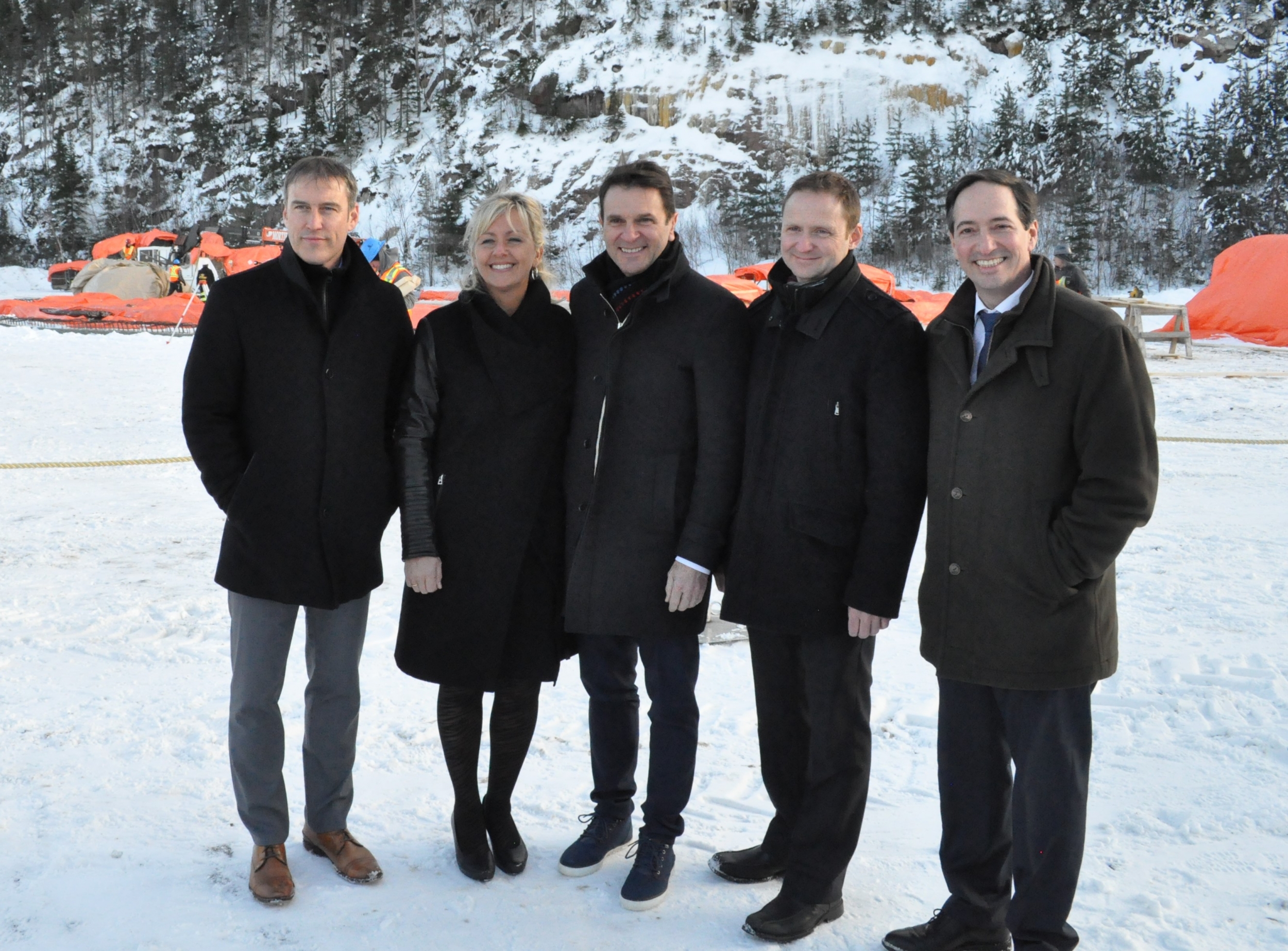 From left to right : Mr Benoit Barrette, President of Barrette-Chapais Ltd, Mrs Andrée Laforest Minister in charge of Saguenay-Lac-St-Jean, Mr François Bonnardel, Minister of Transports, Mr Carl Laberge, General Manager and CEO of Port of Saguenay and Mr Stéphane Bédard, President of the board of Port of Saguenay.